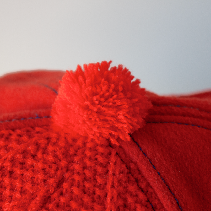 🔴 Full red knit crown with fleece-backed warmth and a cherry red pom